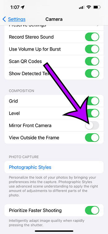 Step 3: Turn on or off the Mirror Front Camera option by tapping the button to the right of it.